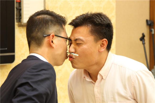 咦?这两个业务部的老大嘴对嘴在干嘛?难道是······可不要想歪了,他们正在玩传递吸管······