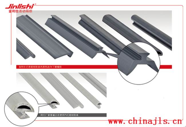当同行厂家普通正在使用PVC密封胶条的时候,金利仕酒楼移动屏风公司已将密封胶条的原料改为丁腈橡胶。丁腈橡胶是由丁二烯和丙烯腈经乳液聚合法制得的,主要采用低温乳液聚合法生产,耐油性极好,耐磨性较高,耐热性较好,粘接力强等特点。产品的耐磨、抗老化及密封性能得到了绝对性的提高,同时不易断裂的特性也大大提升密封胶条的使用年限,从而保证酒楼移动屏风的优秀品质。