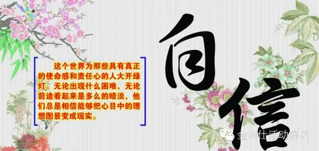正如图上说的:“这个世界为那些具有真正的使命感的责任心的人大开绿灯。无论出现什么困难,无论前途看起来多么 的暗恋,他们总是相信能够把心中的理想变成现实。”这就是自信的表现。